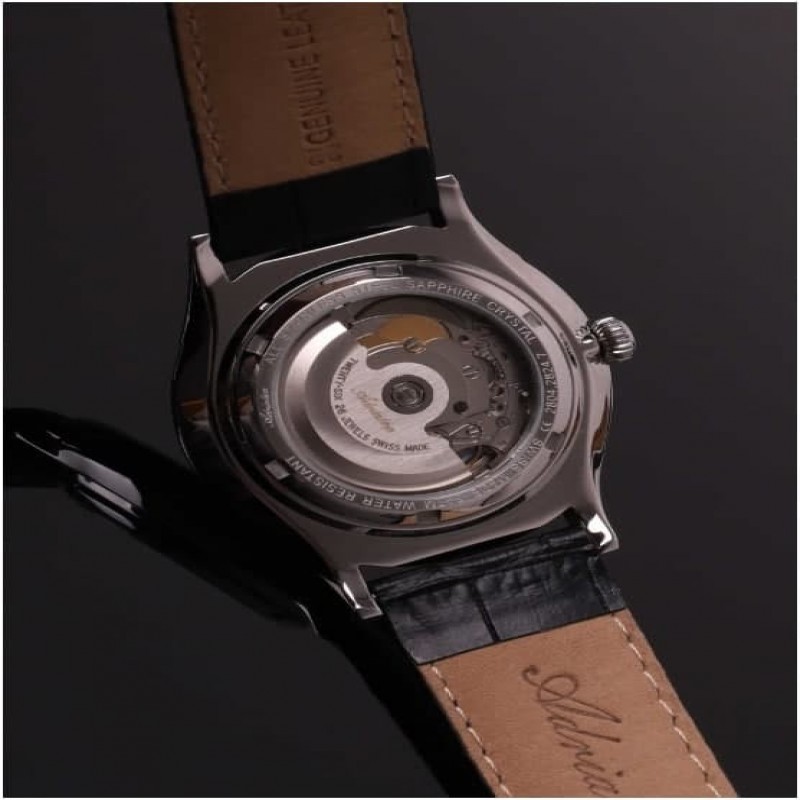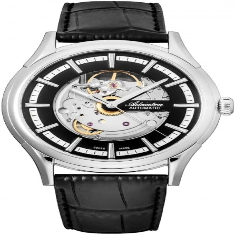 Adriatica est une marque suisse de montres avec presque quatre-vingt-dix ans d'histoire. Les premières montres sous la marque Adriatica ont été produites en Suisse en 1931. Parmi la gamme de modèles constamment renouvelée d'Adriatica, chacun peut trouver une montre à porter au quotidien, adaptée à tout style vestimentaire, ainsi que des modèles pour un look de soirée. Compléter une collection personnelle est possible avec des montres au style sportif ou au design aéronautique populaire. Toutes les montres Adriatica sont fabriquées en acier médical hypoallergénique 316L et en cuir de veau naturel dans la ville de Camorino, située en Suisse. La marque Adriatica fait partie de la Fédération de l'industrie horlogère suisse (Federation of the Swiss Watch Industry FH).Le statut de la marque Adriatica est confirmé par sa participation constante au principal salon horloger mondial BASELWORLD qui se tient en Suisse, ainsi qu'à des salons régionaux dans plus de 90 pays. Modèle mécanique avec remontage automatique (mouvement ETA 2824-2). Verre saphir, bracelet en cuir véritable avec boucle ardillon.