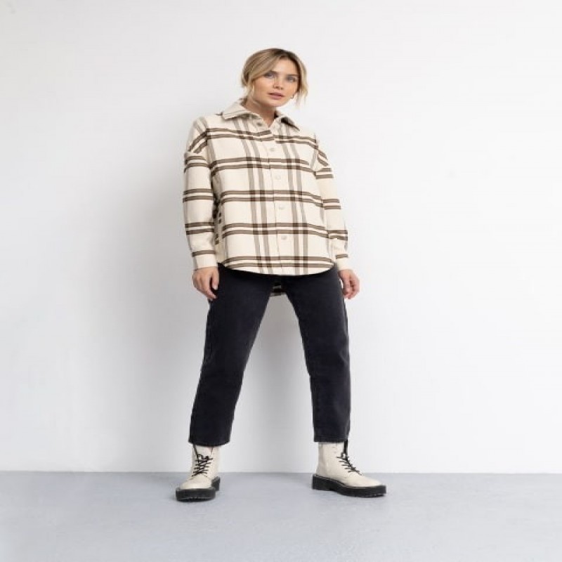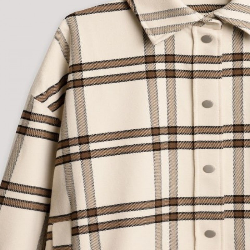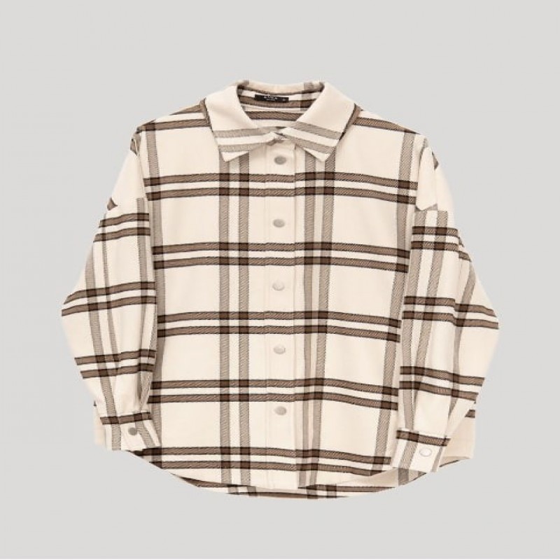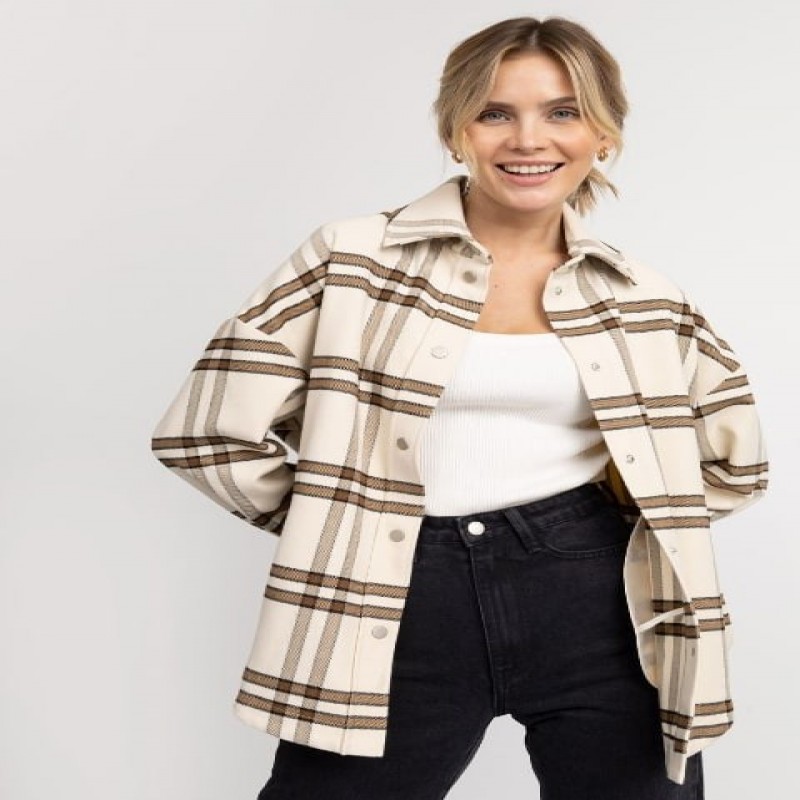 Une chemise beige laconiques à grands carreaux marron - c'est à la fois un look élégant et décontracté tendance de cette saison. La chemise pour femme est fabriquée en doux tissu flanelle avec un léger duvet, qui offre des sensations tactiles incroyables, enveloppant confortablement le corps. Modèle décontracté pour jeunes avec une coupe droite confortable et une ligne d'épaule abaissée qui offre une liberté de mouvement totale. À l'avant de la chemise à carreaux de style anglais se trouvent de grandes poches passepoilées. La chemise chaude se fixe avec des boutons métalliques pratiques. Les longues manches de la chemise décontractée avec des plis et de larges poignets à boutons se ferment solidement.Chemise élégante en tissu mélangé avec col rabattu - un article polyvalent pour les promenades, les voyages à la campagne, les voyages, les vacances et comme option de vêtement d'extérieur pour la mi-saison. La chemise peut être portée seule, comme une veste ou être utilisée pour créer des combinaisons intéressantes en couches avec des t-shirts en tricot, des tops ou des pulls à col roulé. Développer la description polyester 37%, viscose 60%, élasthanne 3%Description