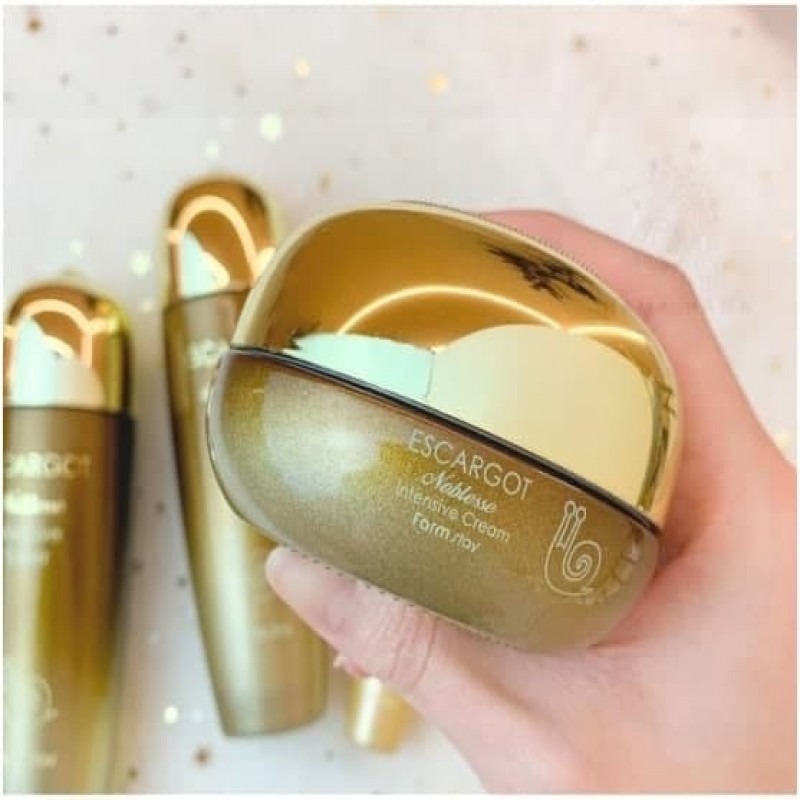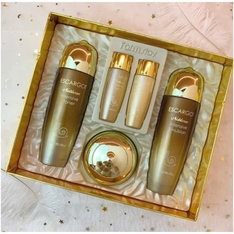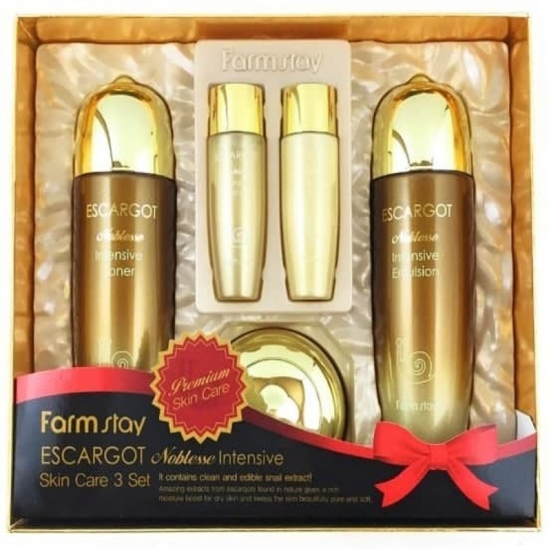 Le coffret cadeau rajeunissant pour la peau du visage avec extrait purifié, obtenu à partir de la slime d'escargot royal - c'est immédiatement 3 produits de soin efficaces pour une nutrition, une hydratation et une restauration quotidiennes de la peau. Le set Farmstay Escargot Noblesse Intensive Skin Care 3 Set comprend un tonique pour la restauration de la peau (150 ml/30 ml), qui élimine tous les signes de sécheresse de l'épiderme, raffermit et lisse, favorise l'augmentation de l'immunité cutanée. Le tonique pour le visage lisse les irrégularités de la texture, éclaircit la pigmentation et les rougeurs, aide en cas d'inflammations. L'émulsion pour l'hydratation et le renforcement de la peau (150 ml/30 ml) avec **extrait d'escargot royal** complète l'effet positif du tonique, normalise l'équilibre hydrolipidique, donne de l'élasticité et de la fraîcheur, égalise la microtexture de l'épiderme. Crème pour le visage nourrissante, hydrate, éclaircit la peau (50 g), avec **extrait d'escargot** ralentit les processus de vieillissement, stimule la production de **collagène**, améliore la circulation sanguine, rend la peau lisse et douce.