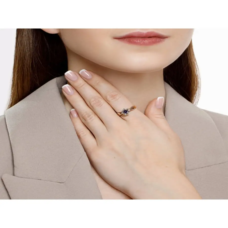 Bague en or féminin avec des diamants et de la tanzanite. Une bague de créateur élégante qui convient parfaitement à un usage quotidien, tout en complétant de manière spectaculaire une tenue de soirée, festive ou de mariage. Les bijoux modernes se marient facilement avec n'importe quel vêtement. Les bijoux SOKOLOV (Соколов) sont livrés avec un emballage cadeau, idéaux pour offrir à une femme, une petite amie, une fille pour un anniversaire, le Nouvel An, le 8 mars, la Saint-Valentin (14 février) ou toute autre fête et occasion. Le poids indiqué sur la photo et dans les caractéristiques est approximatif et peut différer de l'effectif. L'article est en or rouge 585; Insertion : diamant, tanzanite; Caractéristiques : 6 Br Rond 57 0, 129 3/6 A, 1 Tanzanite Rond 5, 00.