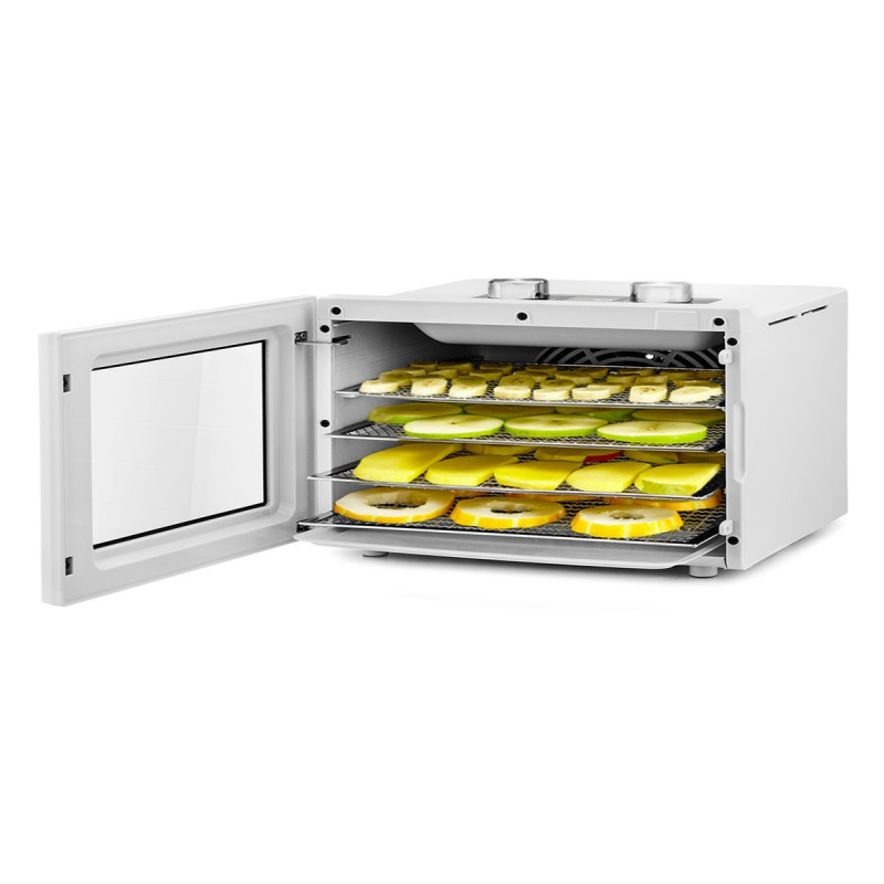 Le déshydrateur électrique est conçu pour sécher des légumes, des fruits, des baies, des champignons, des racines, des herbes et des légumes verts, ainsi que de la viande et du poisson, du pain. Grâce à un plateau spécial pour les liquides, il est possible de préparer de la pâte de fruits. Le déshydrateur est livré avec 4 plateaux en acier inoxydable et 1 plateau pour les liquides. Le déshydrateur est équipé d'un puissant élément chauffant et d'un ventilateur de grand diamètre, assurant une répartition uniforme de l'air chaud dans toute la chambre. Grâce à la circulation horizontale, le mélange des odeurs lors du séchage de différents produits en même temps est minimal. La température de séchage peut être réglée entre 35 et 75 °C par paliers de 5 degrés. Le déshydrateur est équipé d'un minuteur pouvant fonctionner jusqu'à 24 heures avec un pas d'1 heure. Réduire la description