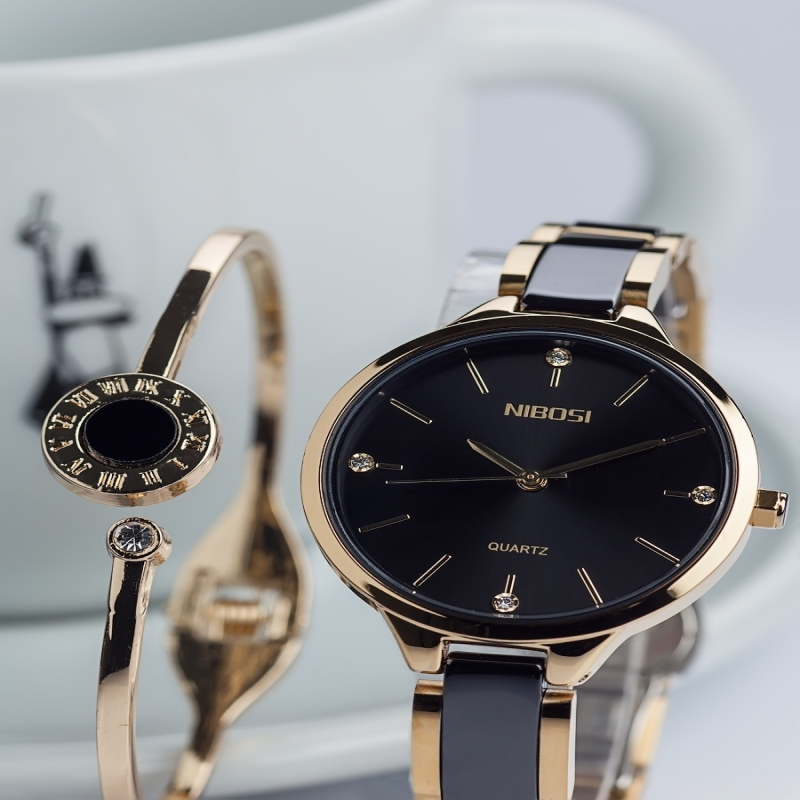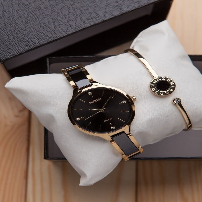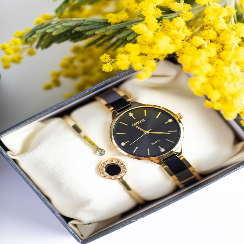 Beau coffret cadeau pour femmes avec montre et bracelet - un cadeau chic pour la petite amie, l'épouse, l'amie, la collègue, la sœur, la mère ou la grand-mère, pour un anniversaire. Grâce à son design à la mode et à son style classique, toute femme sera ravie d'un tel cadeau. Montre classique pour femmes - c'est un design à la mode et moderne. Bracelet élégant en cadeau. Vous n'avez plus besoin d'assortir les bracelets aux montres, ni les montres aux bracelets. Ce coffret cadeau raffiné pour femmes avec montre et bracelet plaira sans aucun doute à chaque dame. Le bracelet cadeau peut légèrement différer du bracelet sur la photo (en couleur). Le bracelet en métal de la montre est réglable, les maillons supplémentaires sont retirés selon votre taille de poignet. Mécanisme à quartz japonais de qualité fonctionnant sur batterie. Le boîtier de la montre et du bracelet est fabriqué en matériau de qualité - acier inoxydable hypoallergénique, lors du port, le revêtement ne s'efface pas et ne noircit pas.Les montres seront livrées dans une boîte cadeau, présentable, avec un coussin, qui sera utile pour le rangement de l'accessoire féminin. Développer la description